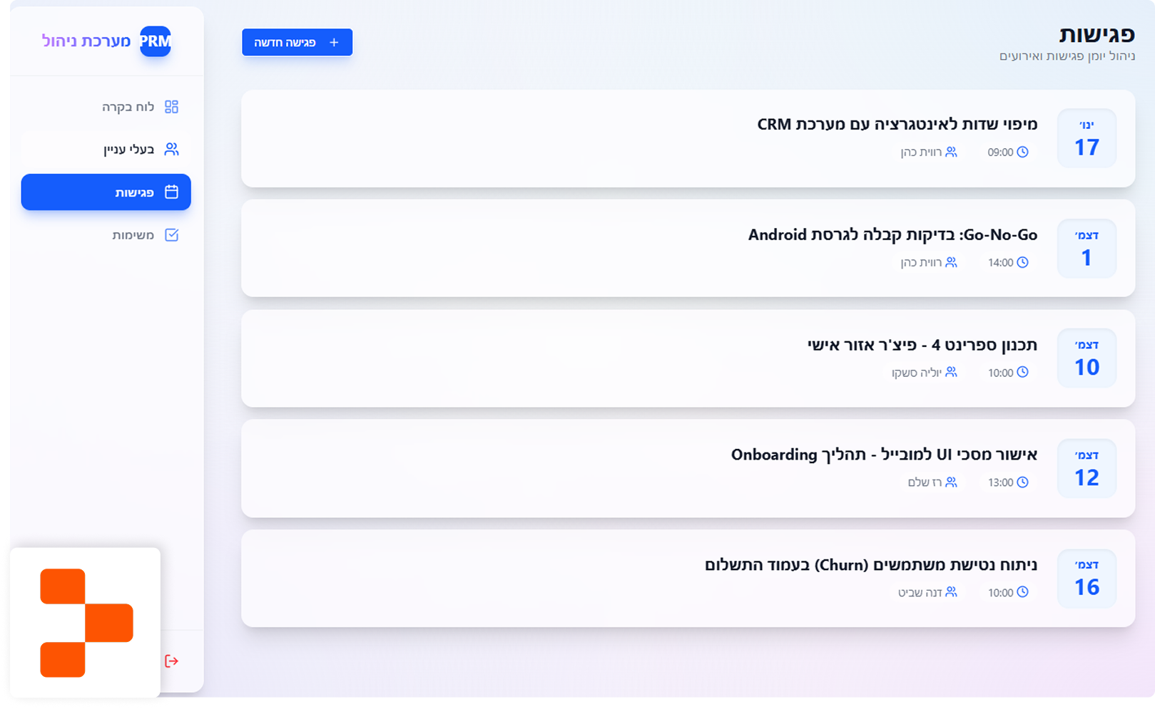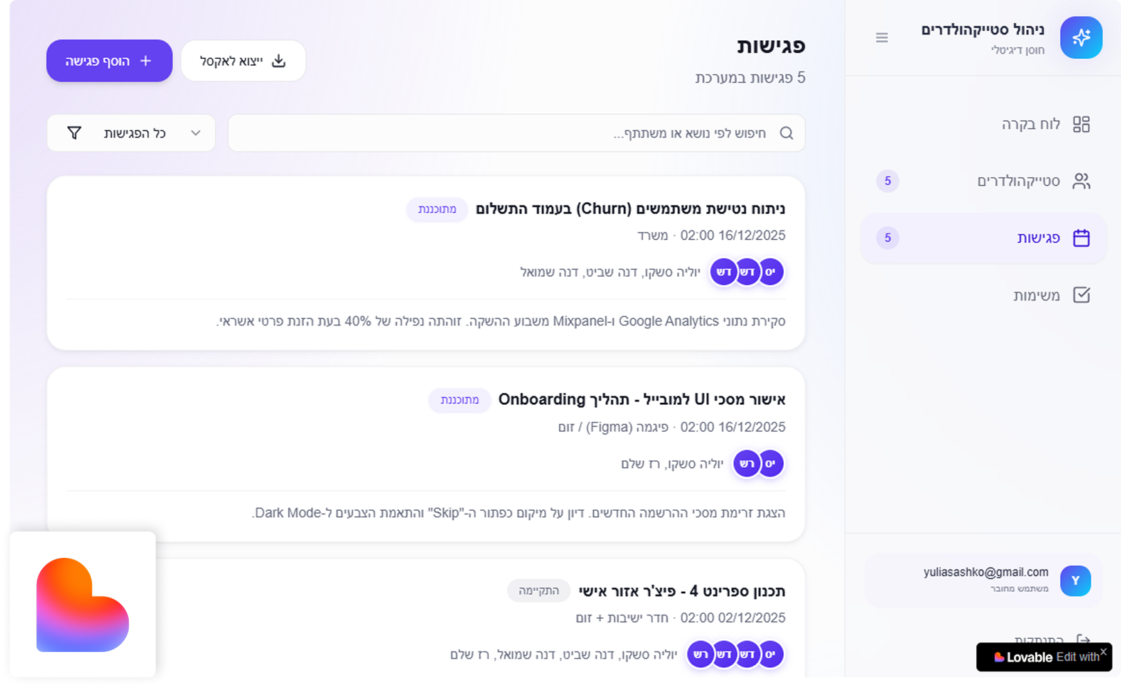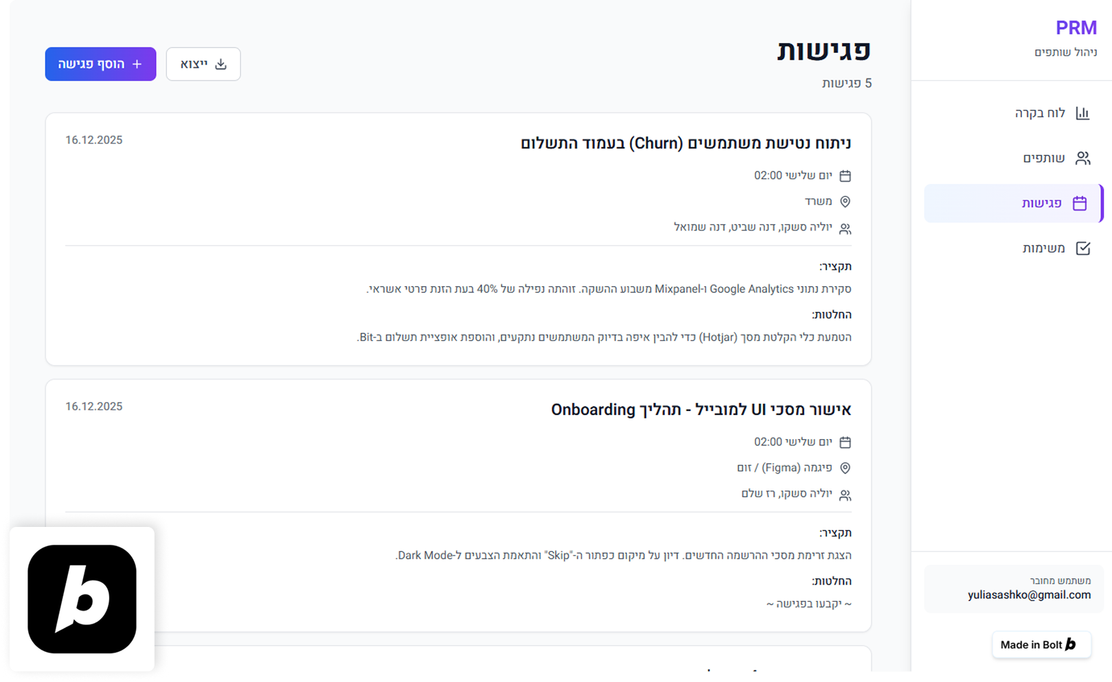 הצורך שלי: אני משתמשת במאנדיי לניהול הפרויקט, אבל מצאתי שהוא מורכב מדי לניהול המטריציוני שאני עושה עם הרבה סטייקהולדרים. הייתי צריכה כלי פשוט שאוכל להזין לשם פגישות, לעקוב אחריהן, ולראות במבט על מה קורה בלי לפספס פגישות חשובות.