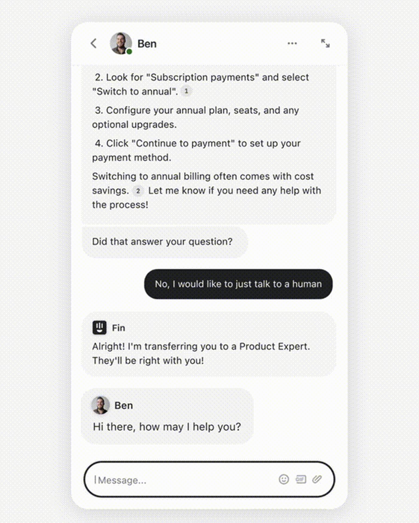 וכשגם ה-AI וגם המשתמש תקועים, צריך בן אדם. ב-Fin AI, המעבר לנציג קורה בתוך השיחה הטבעית. ה-AI לא מפנה לכפתור חיצוני, אלא מציע להמשיך עם אדם כשלב הגיוני בזרימת השיחה עצמה. במוצר AI שעיצבתי לחברת SaaS, הוספנו כפתור "Talk to support" בצד השיחה. אנשים השתמשו בו, לא הרבה, בערך 8% מהשיחות, אבל מספיק. וזה בדיוק מה שרצינו: רשת ביטחון שנותנת ביטחון גם כשלא משתמשים בה.